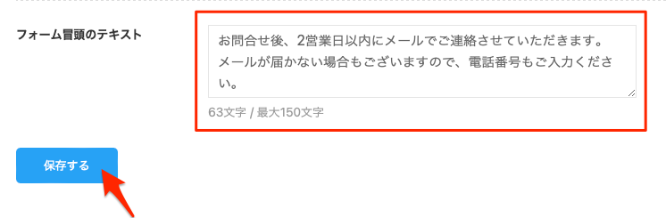 フォームの設定項目が表示されるので、「フォーム冒頭のテキスト」の入力欄に上書きされたい内容を入力して「保存する」をクリックします。